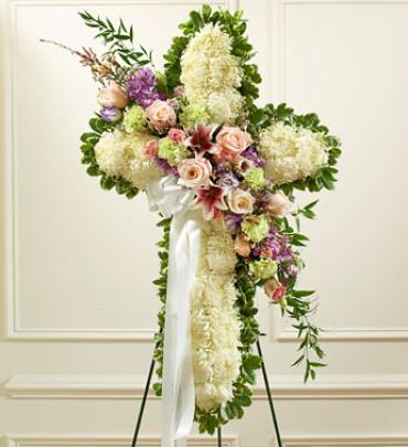 This beautiful white floral cross with a break of comforting pastel flowers shows your compassion, faith and love with thoughtful funeral flowers during this difficult time. Note: Image shown is Premium.